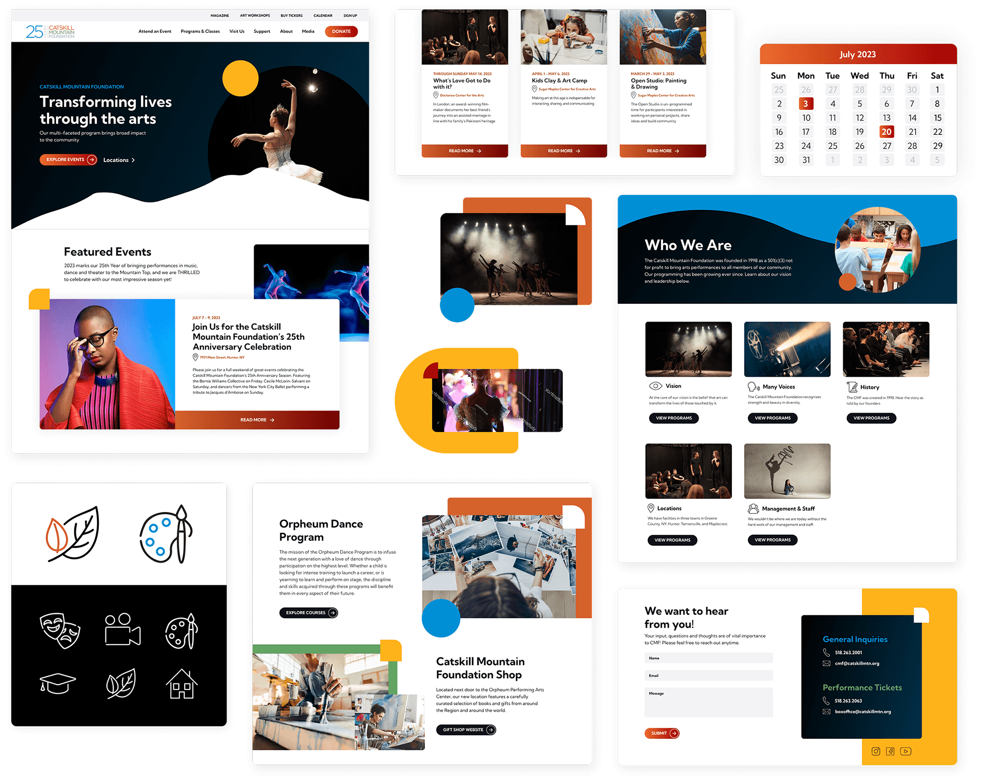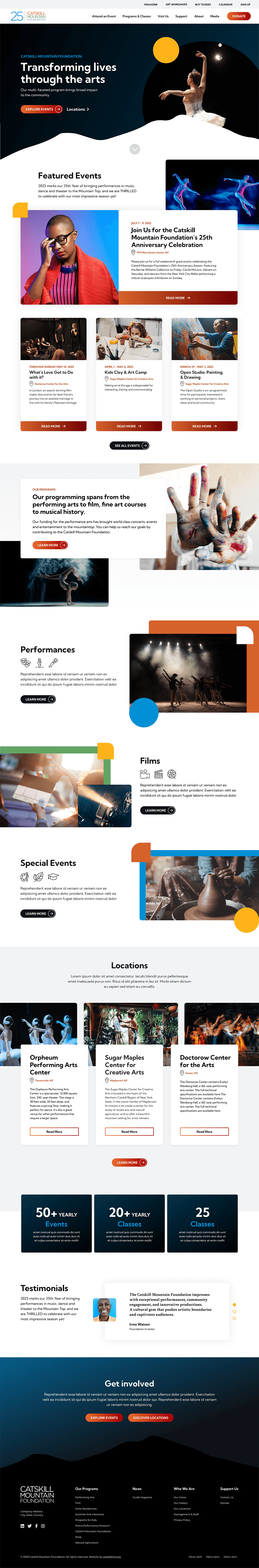 The Catskill Mountain Foundation is a 501 (C)3 non-profit corporation dedicated to arts, culture and educational enhancements in the northern Catskill Mountain region. This project began in January 2023 and launched in July 2023. This was a full website design utilizing modules to speed up production while maintaining the integrity of the design. CMF came to us with very little brand, therefore I was able to expand what they had and really help to create something unique for this client.